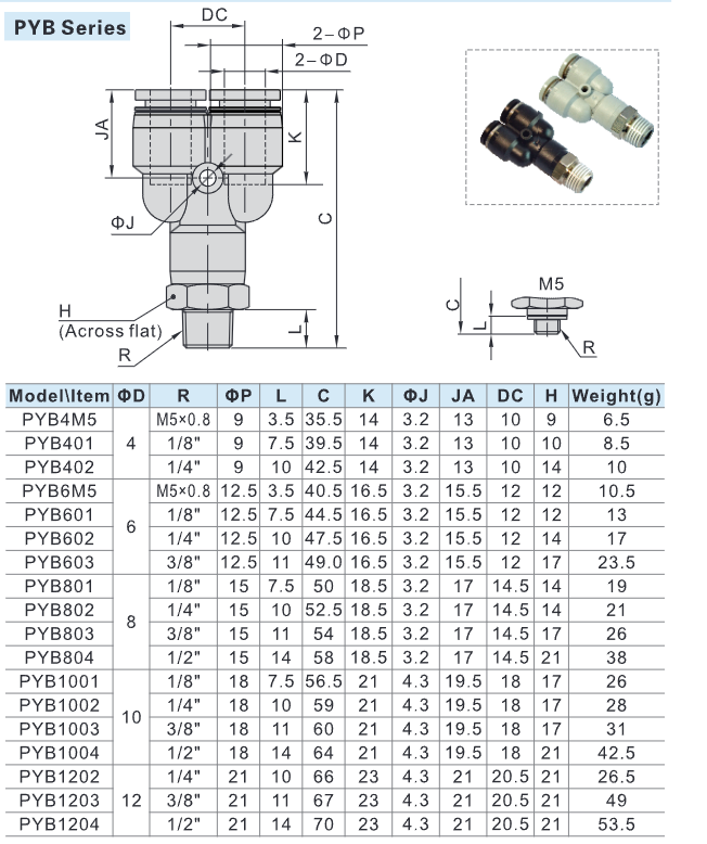 The Airtac PYB Series Male Y Branch Pneumatic Fitting is a high-performance Y-shaped push-in connector designed for efficient air distribution in pneumatic systems. Made from SUS304 stainless steel, it ensures excellent corrosion resistance, secure sealing, and long-lasting durability. Its compact Y-branch design allows smooth airflow splitting and easy installation for nylon and polyurethane tubing in industrial applications.