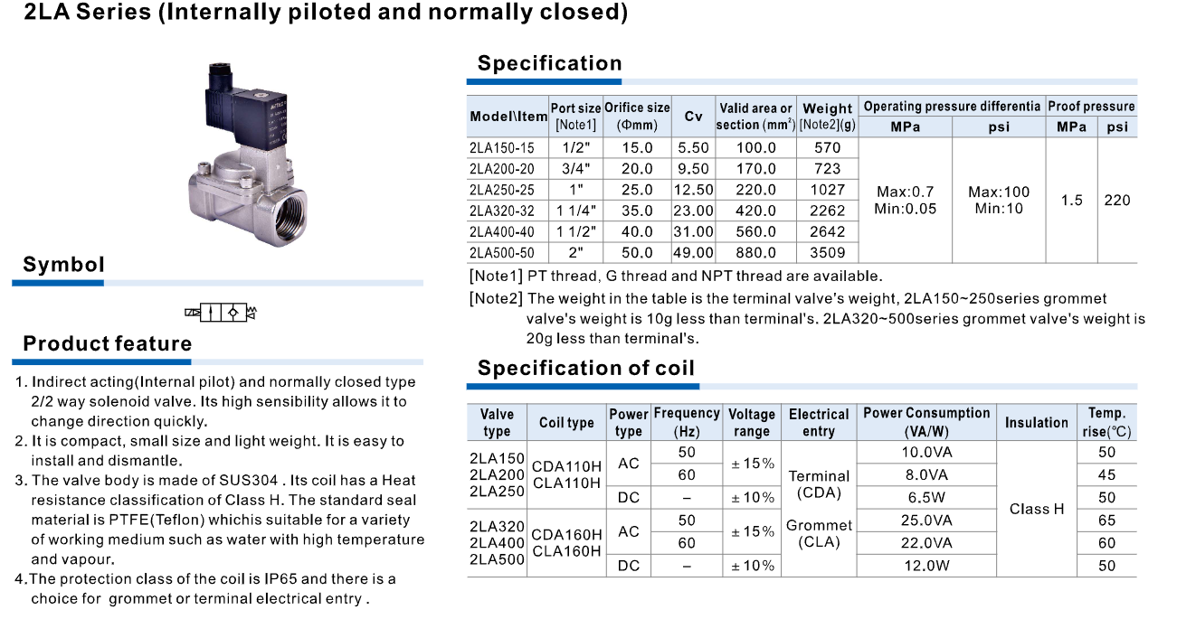 The 2LA Series solenoid valve is a 2/2 way normally closed valve designed with an internally piloted mechanism that ensures fast response and stable operation. The valve body is manufactured from durable SUS304 stainless steel combined with a heat-resistant PTFE seal, making it suitable for water, steam, and high-temperature fluids. With its compact structure, easy installation, and IP65 coil protection, this valve is widely used in industrial automation, water supply systems, steam control systems, and various manufacturing processes.