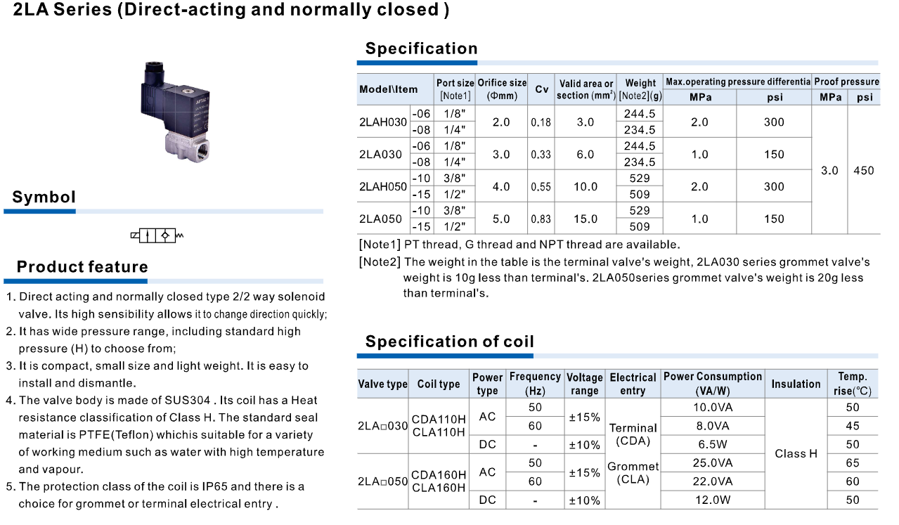 The AirTAC 2LA Series is a 2/2 way normally closed solenoid valve featuring direct acting operation, allowing fast switching and stable performance even at low pressure conditions. The valve is built with a SUS304 stainless steel body for excellent corrosion resistance and durability, combined with PTFE (Teflon) seals suitable for high-temperature fluids such as water and steam. With a compact design, high sensitivity, IP65 protection coil, and Class H insulation, the valve ensures reliable operation in industrial environments. It is widely used in steam systems, automation equipment, industrial machinery, and fluid control applications.
