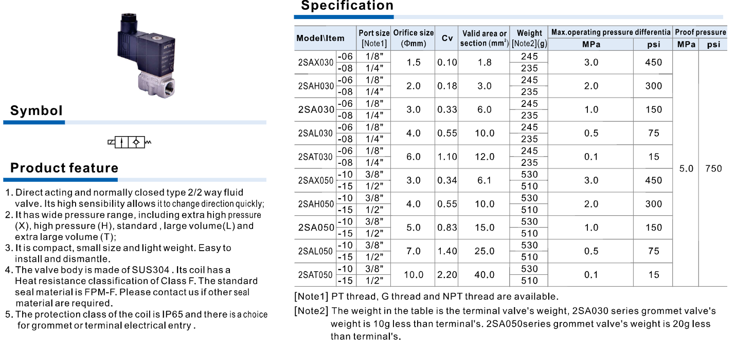 The 2SA Series direct-acting solenoid valve is a compact and high-sensitivity 2/2 way normally closed valve designed for precise control of air, water, and oil systems. Made from durable SUS304 stainless steel with IP65 coil protection and Class F heat resistance, it offers reliable performance across a wide pressure range. Its lightweight and compact design allows easy installation in industrial automation, pneumatic, and fluid control applications.