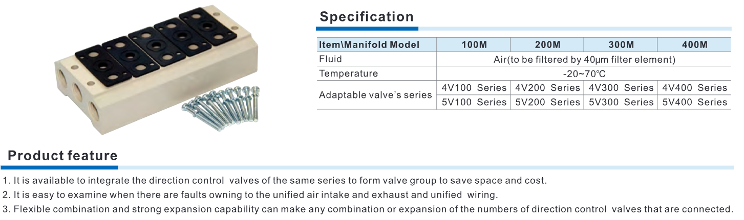 The 4V/5V Series solenoid valve manifold (100M, 200M, 300M, 400M) is a pneumatic manifold base designed to integrate multiple directional control valves into a single compact unit. This manifold distributes compressed air from a common inlet to multiple solenoid valves, improving system efficiency.