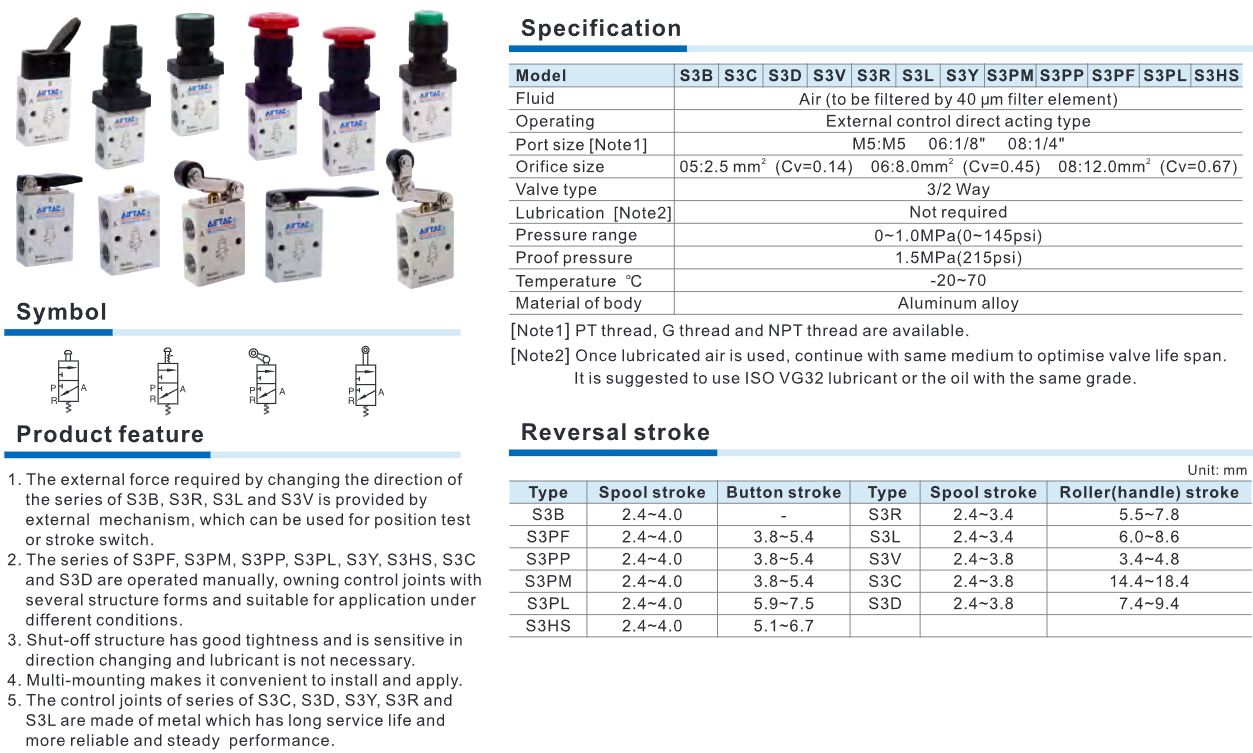 / S3 Series 3/2 Way Pneumatic Control Valve, Mechanical Push Button Lever Roller Air Directional Valve, Aluminum Pneumatic Valve