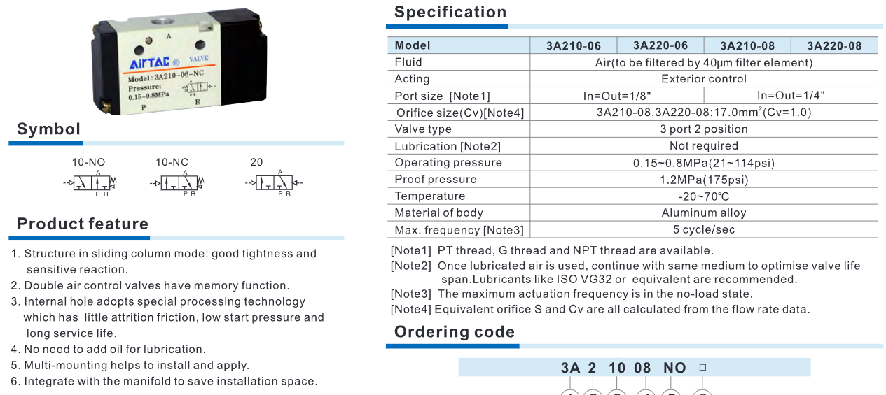 / AIRTAC 3A200 Series Pneumatic Air Valve (3A210-06, 3A220-06, 3A210-08, 3A220-08) – 3/2 Way Directional Control Valve