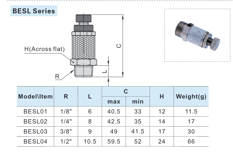 Thông số kỹ thuật Airtac BESL Giảm Thanh Khí Nén Inox Có Điều Chỉnh:
