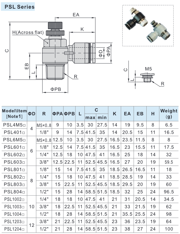 - PSL là van tiết lưu khí nén dạng co (elbow flow control valve) tích hợp đầu nối nhanh.
