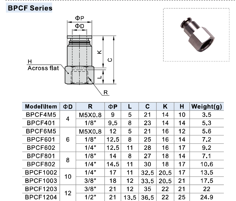 Khái niệm sản phẩm BPCF Series - Đầu Nối Kim Loại Ren NgoàiBPCF Series là đầu nối khí nén kim loại ren ngoài, được thiết kế để kết nối các ống khí trong hệ thống khí nén. Sản phẩm này có khả năng chịu lưu lượng cao, thích hợp cho các ứng dụng yêu cầu kết nối chắc chắn và hiệu suất ổn định. Với vật liệu kim loại mạ niken, BPCF Series không chỉ mang lại khả năng chống ăn mòn mà còn hoạt động tốt trong môi trường có nhiệt độ cao.