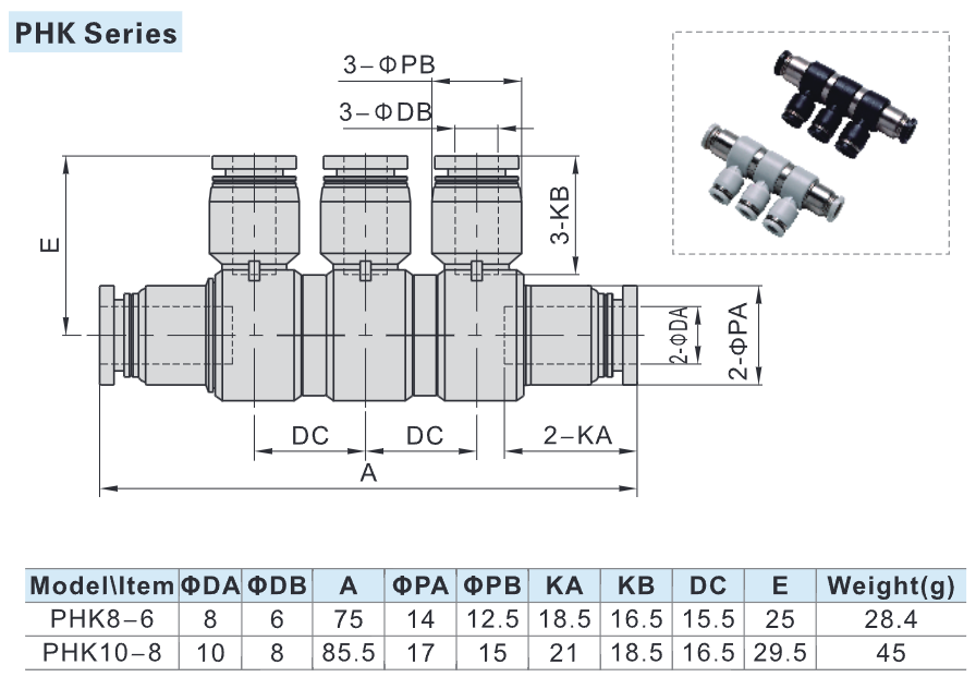 Thông số kỹ thuật Co Nối Khí Nén 3 Nhánh PHK