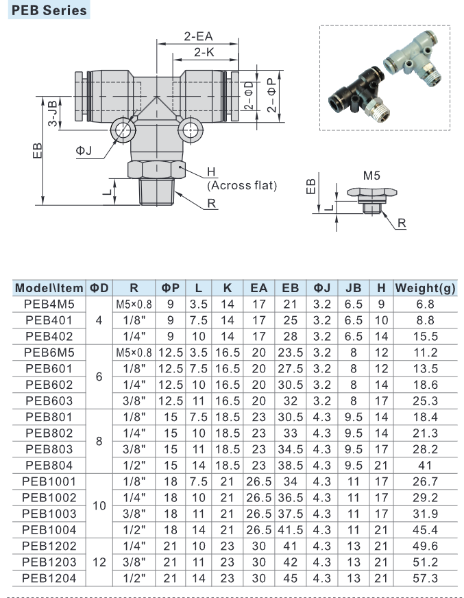 PEB Series là dòng co nối khí nén chữ T có ren ngoài (male thread tee fitting) dạng push-in, cho phép vừa chia nhánh khí vừa kết nối trực tiếp vào thiết bị thông qua ren. Sản phẩm giúp tối ưu hệ thống khí nén, giảm số lượng phụ kiện và đảm bảo hiệu suất vận hành ổn định.
