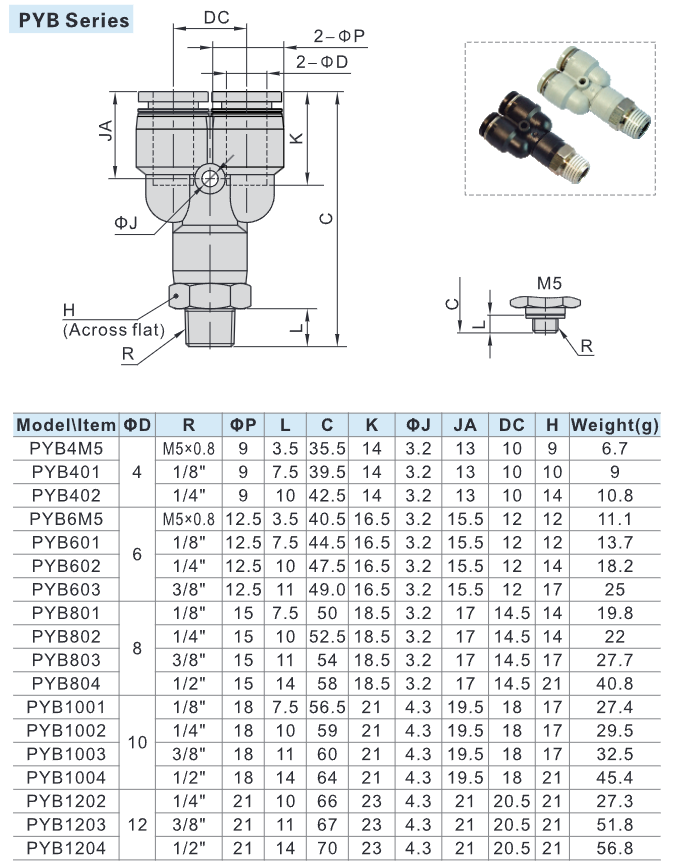 Thông số kỹ thuật Co Nối Khí Nén Chữ Y Có Ren Ngoài PYB