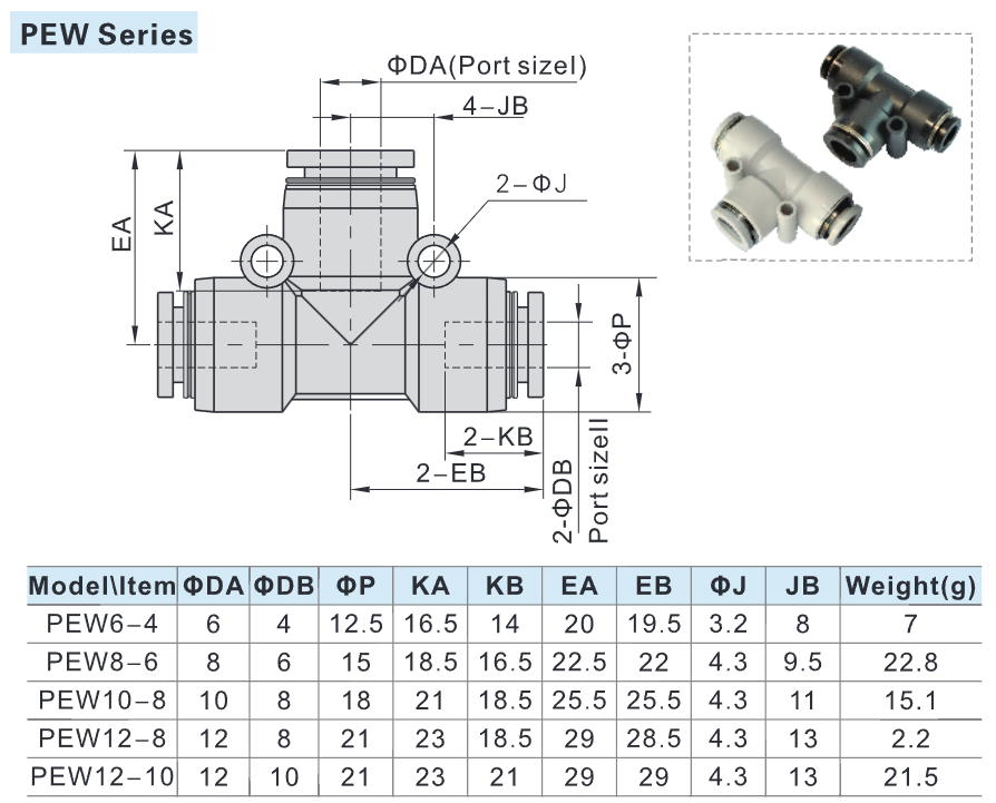 Thông số kỹ thuật Co Nối Khí Nén Chữ Y Giảm PEW