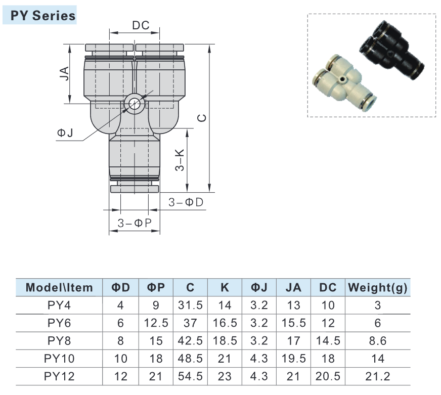 Thông số kỹ thuật Co Nối Khí Nén Chữ Y PY