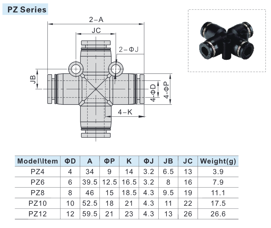 Thông số kỹ thuật Đầu Nối Khí Nén 4 Ngã PZ