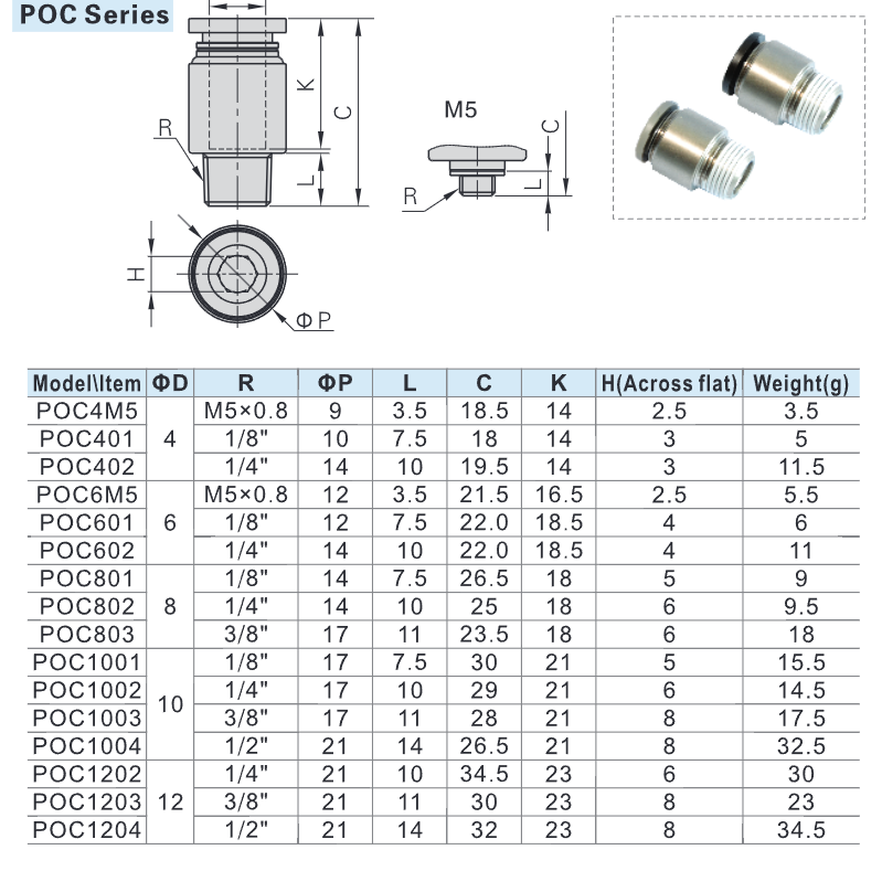 Thông số kỹ thuật Đầu Nối Khí Nén Airtac POC Ren Ngoài: