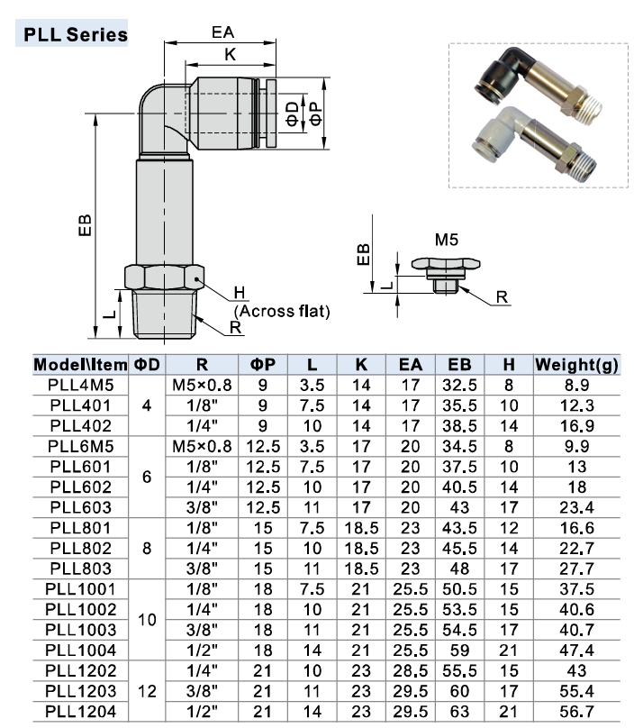 - PLL là loại đầu nối nhanh dạng góc 90° (elbow fitting) kết hợp ren ngoài và đầu cắm ống.