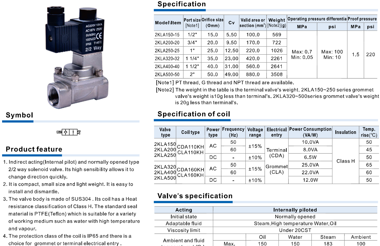 / Van điện từ hơi nước AirTAC 2KLA Series Normally Open, Van điện từ inox SUS304 2/2 Way Steam Solenoid Valve 2KLA150 2KLA200 2KLA250