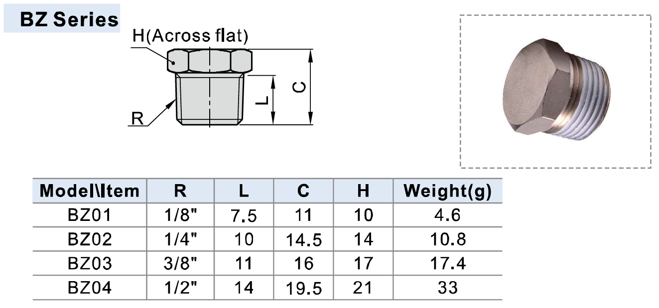 Thông số kỹ thuật Nút Bịt Khí Nén Dòng BZ