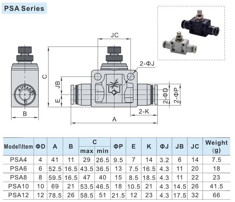 Thông số kỹ thuật PSA-S Khớp Nối Nhanh Airtac Inox Điều Chỉnh Tốc Độ Dạng Thẳng