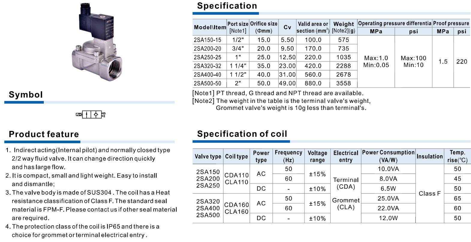 / Van Điện Từ 2SA Series – Van Solenoid 2/2 Thường Đóng Inox SUS304 (AC/DC 12-220V)