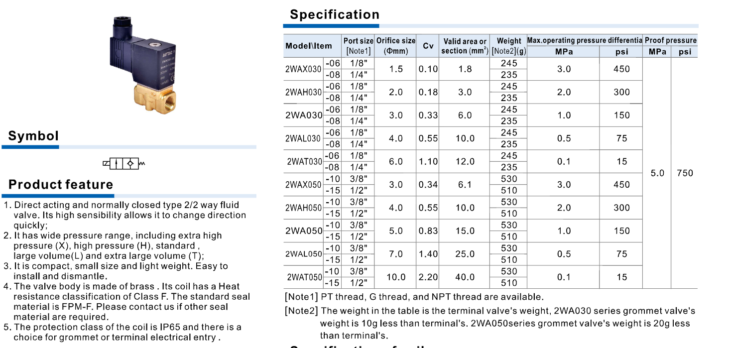 Thông số kỹ thuật Van Điện Từ 2WA Series 2/2