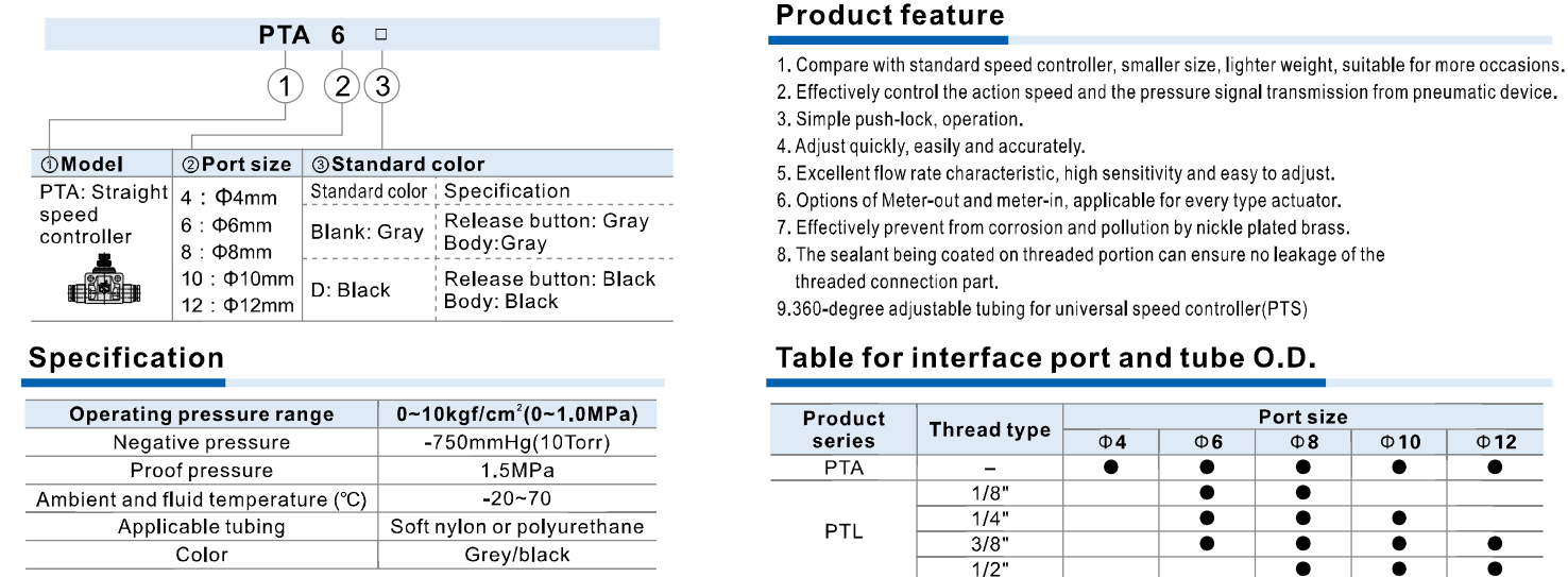 - PTA là loại van tiết lưu khí nén (flow control valve) cho phép điều chỉnh lưu lượng khí theo nhu cầu.