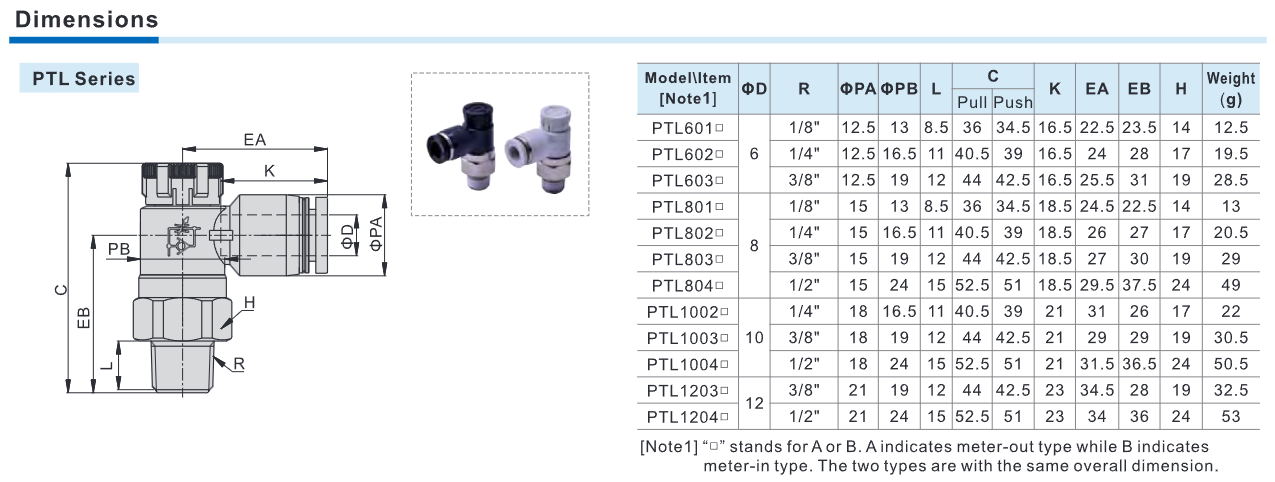 - PTL là van điều chỉnh lưu lượng khí nén dạng co (elbow flow control valve).