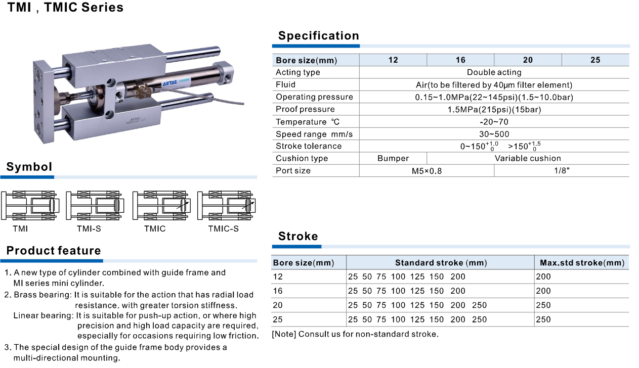 / Xi Lanh Khí Nén Dẫn Hướng TMI TMIC, Xi Lanh 2 Ty Dẫn Hướng Double Acting 12–25mm