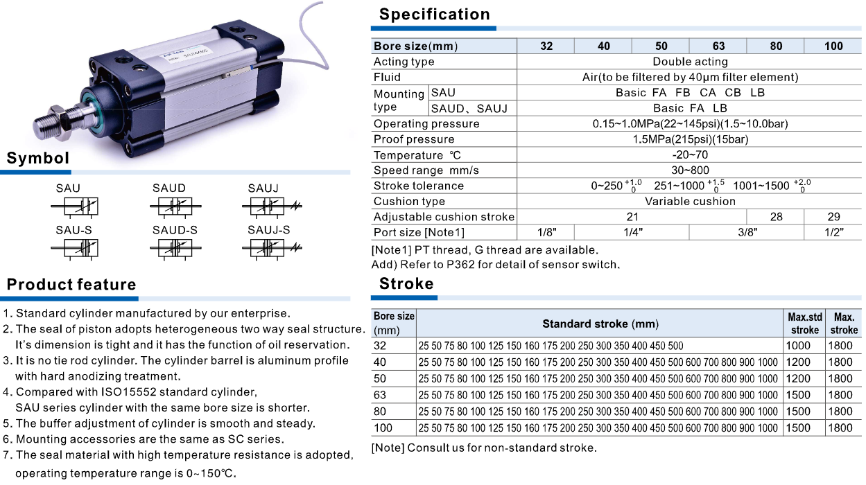 / Xi Lanh Khí Nén SAU / SAUD / SAUJ Series – Cylinder Nhôm Không Ty ISO, Giảm Chấn Điều Chỉnh Cho Tự Động Hóa Công Nghiệp